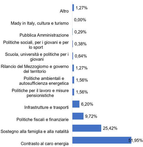 Come si evince dalla tabella 2) e dal grafico 2) i quattro punti del programma su cui sono stati allocati più risorse risulta essere “Contrasto al caro Energia” (più di 8 miliardi pari a circa il 52%) “Sostegno alla famiglia e alla natalità (4 miliardi pari a circa il 25%), “Politiche fiscali e finanziarie” (più di 1,5 miliardi pari a circa il 10%) e “Infrastrutture e trasporti” (circa 1 miliardo con un valore percentuale di circa il 6 %)