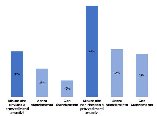 Il grafico 3) che segue, evidenzia il rapporto tra misure che rinviano a provvedimenti attuativi, pari al 33%, di cui il 21 % non hanno stanziamenti allocati e il 12 % invece hanno stanziamenti, e misure che non rinviano a provvedimenti attuativi (pari al 67%) di cui il 35 % non hanno stanziamenti mentre il 32% presentano stanziamenti.