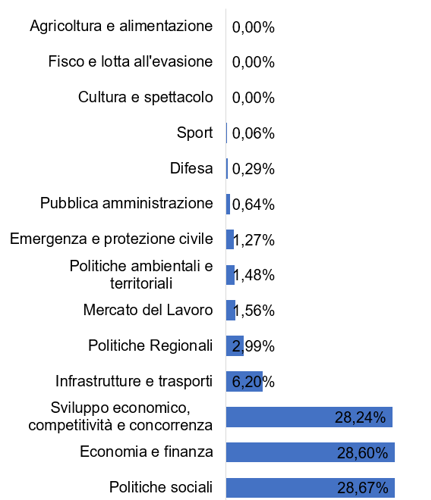 Come si evince dal grafico, la maggiore percentuale di risorse, circa l'85% è stata destinata alle politiche pubbliche riguardanti il sostegno alle imprese rappresentate dalla policy “ Sviluppo economico, competitività e concorrenza”, il sostegno alle famiglie rappresentato dalla policy “ Politiche sociali” e l'adozione di disposizioni in materia di finanza pubblica rappresentata dalla policy “ Economia e finanza”.
