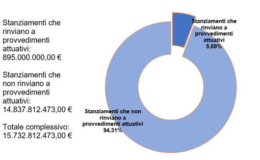 Il grafico 4) evidenzia la differenziazione in percentuale tra stanziamenti legati a misure autoapplicative, che esplicano la loro efficacia senza il ricorso ad un intervento normativo di secondo livello (pari all'94,31 % del totale), e stanziamenti che per essere utilizzati dovranno essere utilizzati dell'adozione di provvedimenti attuativi che risultano essere pari a circa il 6%.